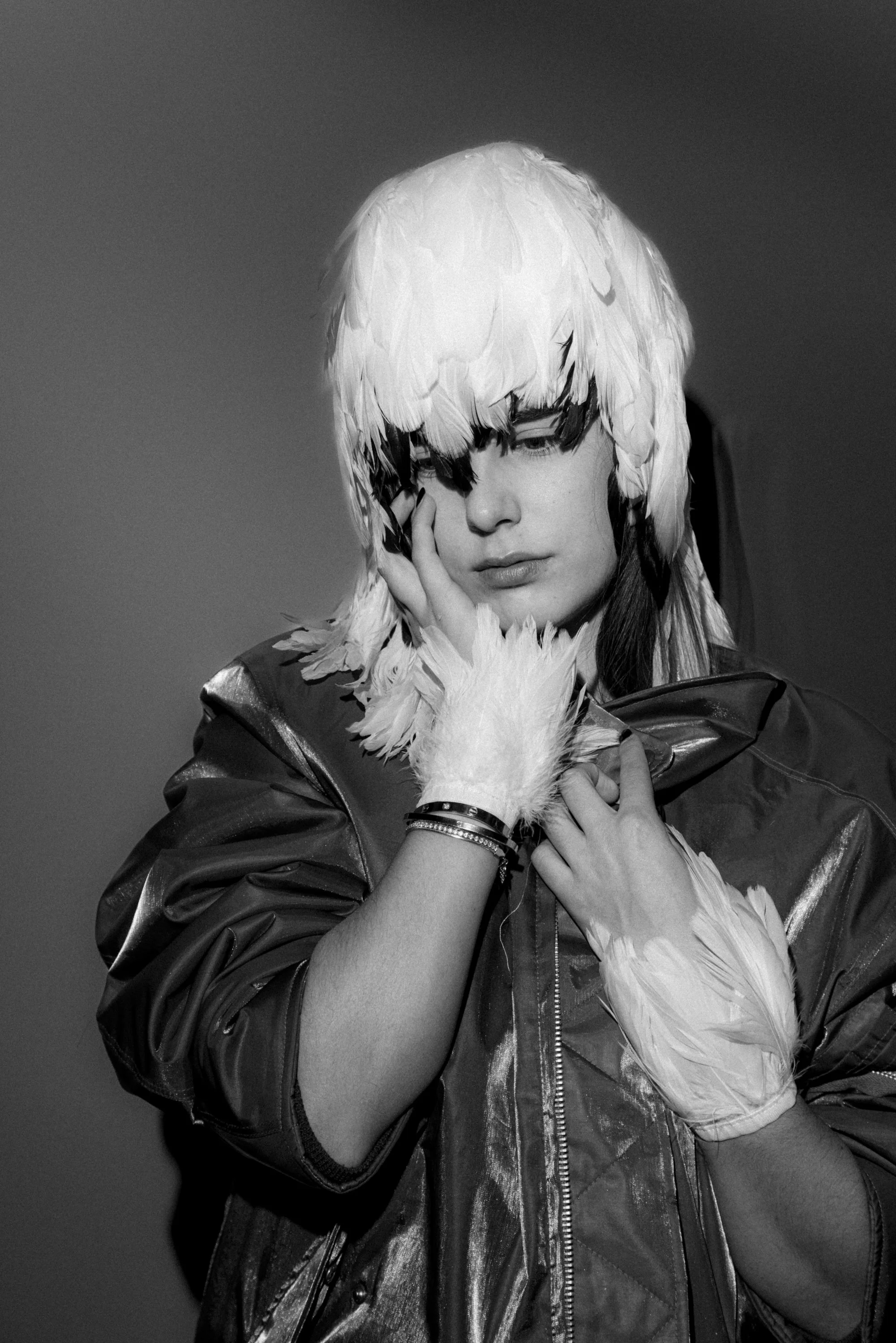 Black and white portrait of a person wearing a feathered headpiece and coat, with eyes closed and hand on face.